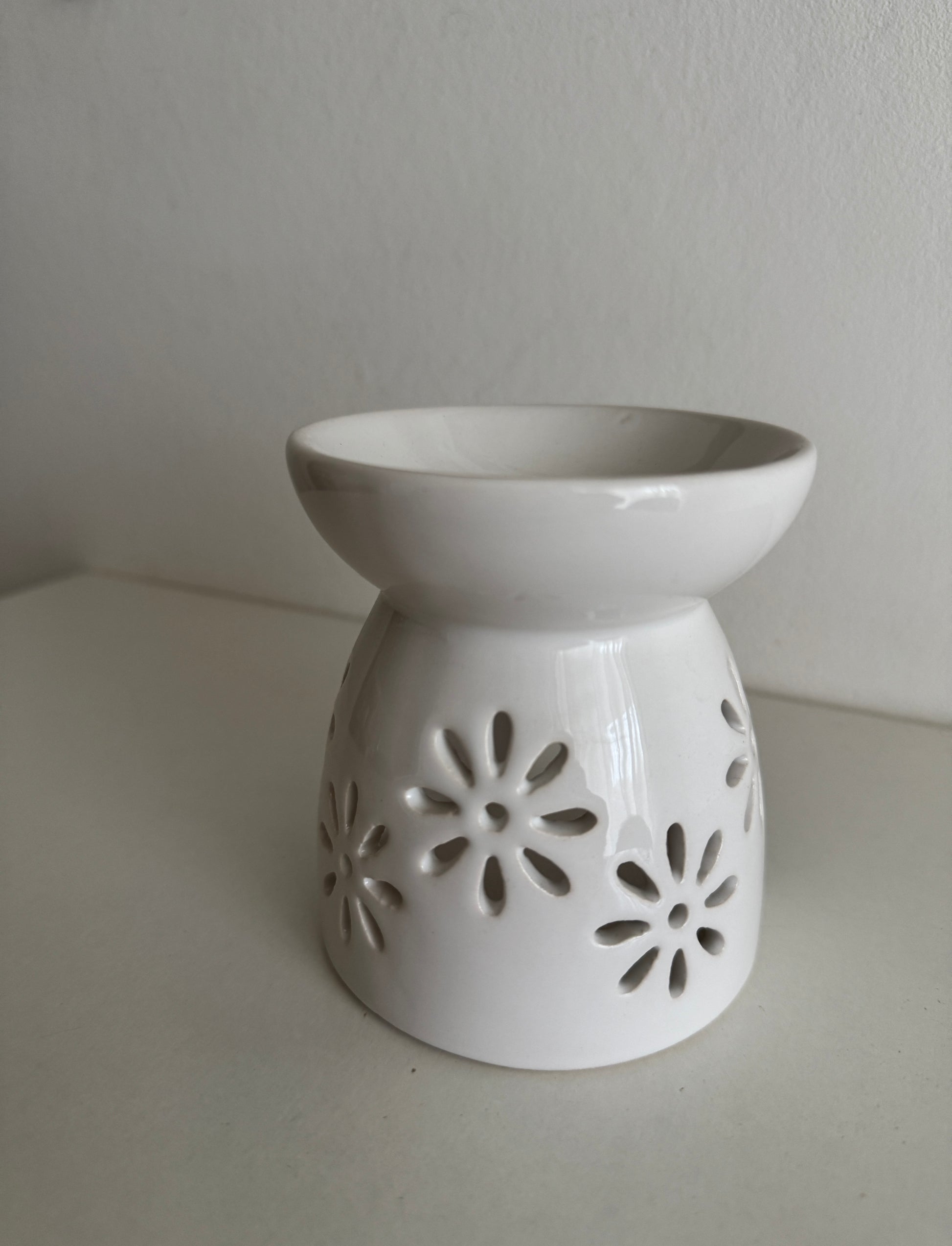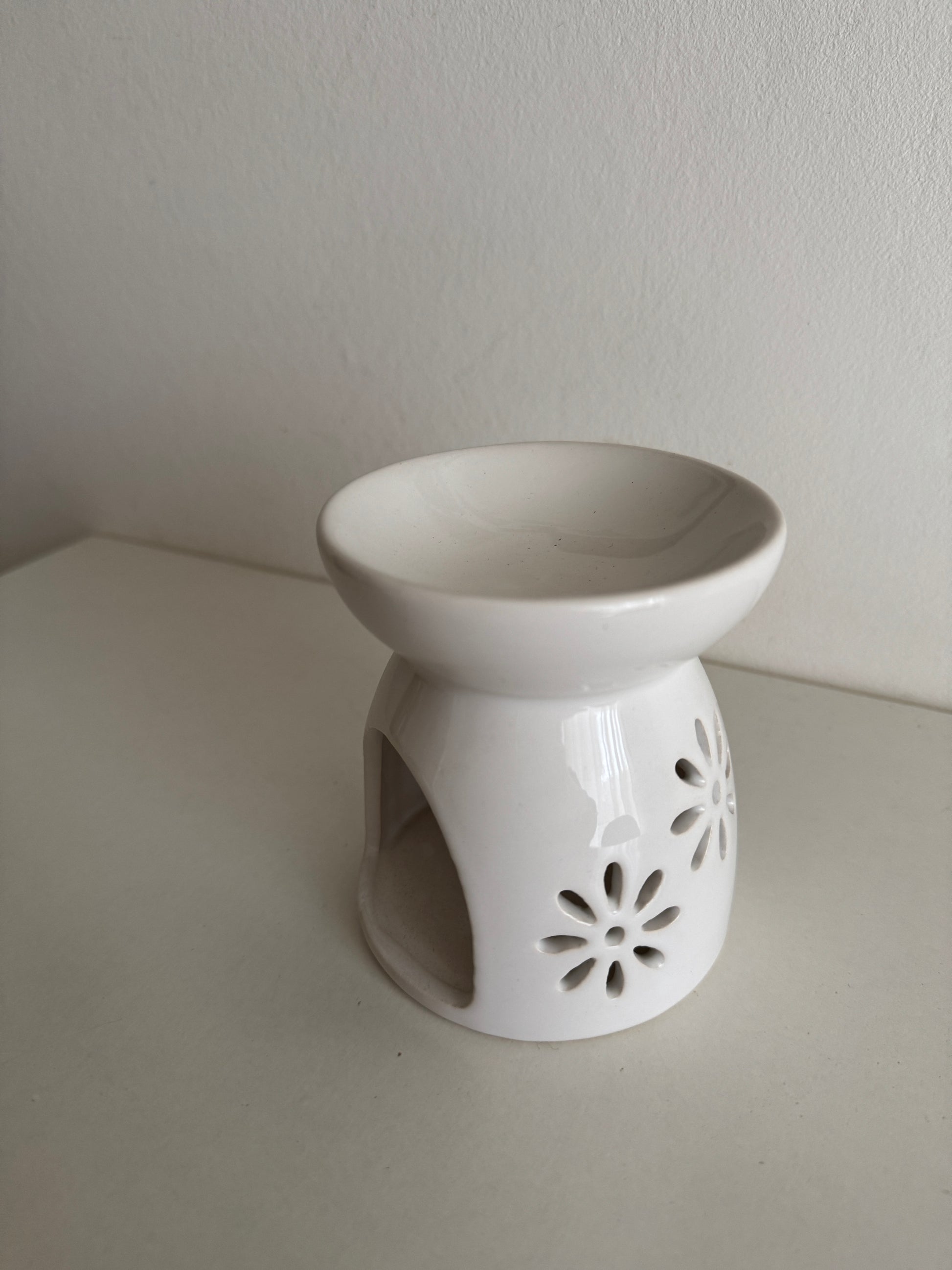 Brûleur à fondants en céramique blanche – Élégant et raffiné, ce brûleur ajouré de motifs floraux diffuse délicatement vos fondants parfumés pour créer une ambiance chaleureuse et apaisante dans votre intérieur.