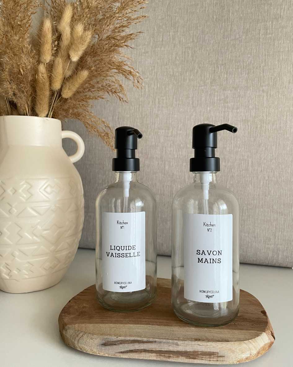 Parce que même le savon et le liquide vaisselle mérite d'être mis en valeur en cuisine ! Homebycelina à décidé de créer de jolis étiquettes pour chaque distributeur.